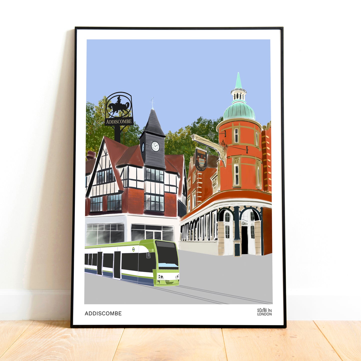 Featuring the beautiful architecture on Lower Addiscombe Road, the tram, the old Leslie Arms pub, the Addiscombe iron sign and trees from Addiscombe Recreation ground, Ashburton Park and the Railway Park.