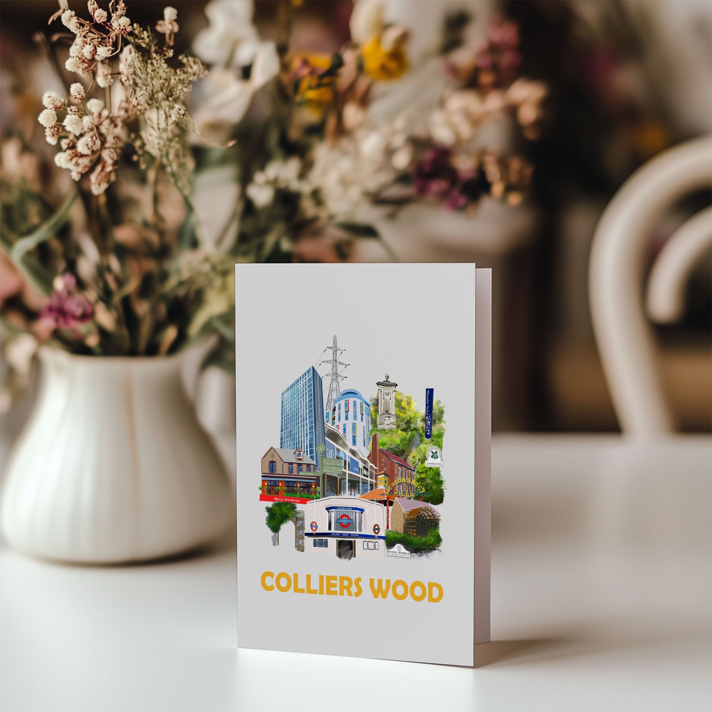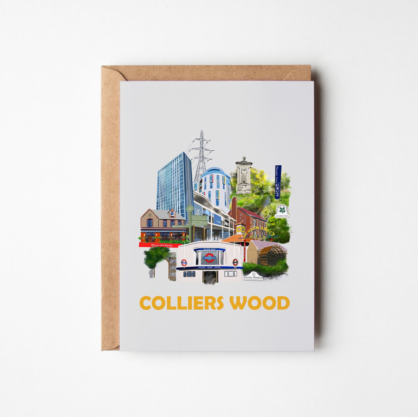 A charming greeting card capturing the variety of diverse architecture in Colliers Wood, South London.