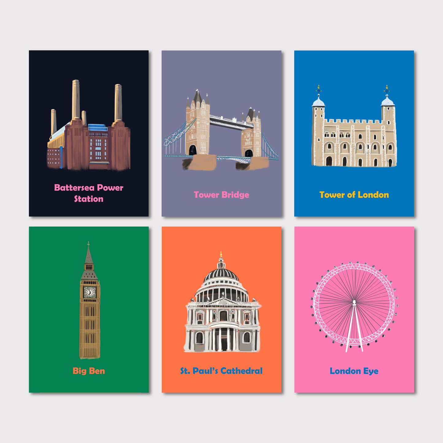 Striking designs featuring six key London landmarks: The London Eye, St Paul's Cathedral, Big Ben, Battersea Power Station, The Tower of London and Tower Bridge.