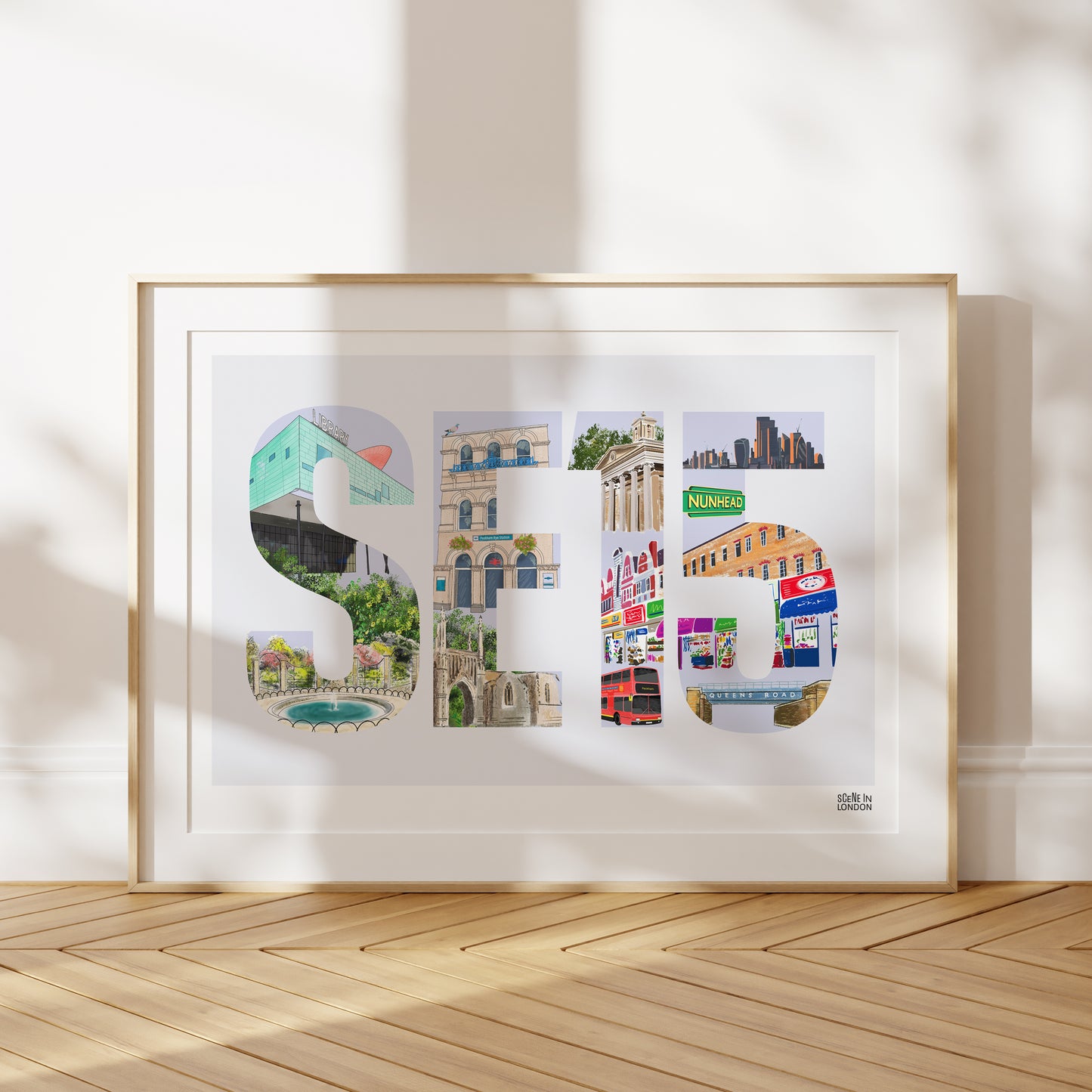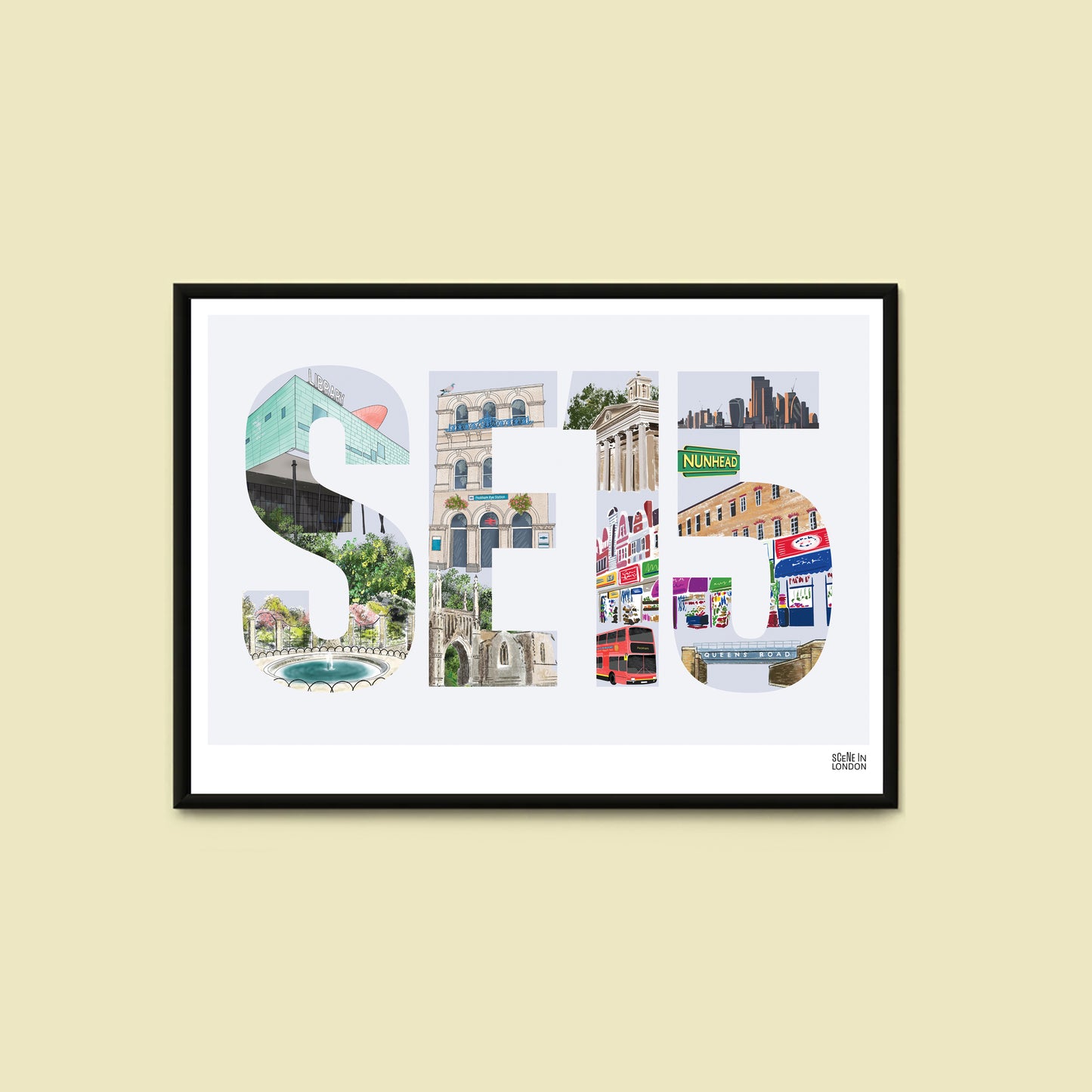 A unique London postcode print featuring local landmarks in SE15, Peckham and Nunhead.